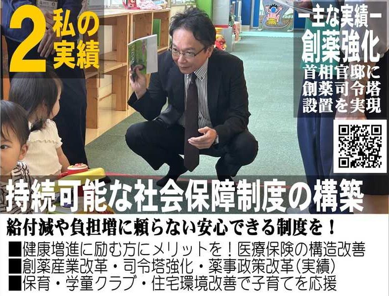 座長を務める党社会保障制度調査会の創薬力強化PTで、累次の提言により、官邸に創薬力強化のための司令塔準備組織の設置を実現しました。コロナで国産ワクチン開発が遅れたことを教訓に、医薬品の開発・生産体制強化を提言。研究開発資金調達、治験環境整備、有事の薬事承認制度創設、設備投資支援や生産後の政府買い上げなど、日本の創薬力の国際競争力を強化し、また製薬事業者が積極的に医薬品開発に取り組める体制整備の提言でした。同会議において、提言最大の焦点である司令塔機能とガバナンス強化の仕組み作りをして頂いてます。参考:「構造改革」ミクス「財政フレーム」月刊薬業「財政的制約の中で限界」ミクス「グローバルな創薬エコシステム」ミクスミクス2024.12「GMP」日刊薬業「ワクチン開発の司令塔」日経ビジネス「ワクチン司令塔」読売新聞「国産ワクチン開発支援」四国新聞。なお、2025年夏現在の最新の提言では産業構造に言及した上で我々が考える望ましい方向性を示すなど、今後の具体的措置の提言のための中間報告的位置づけとしました。参考:「創薬力の抜本的強化に向けた提言」自民党