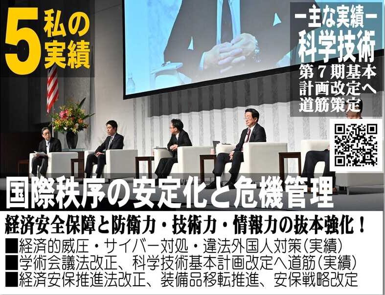 技術流出により日本の国富が失われている問題について、事務局長を務める党経済安全保障推進本部で、包括的な技術流出対策の議論を行い、提言としてまとめ政府に提出しました。2025年に改正が検討されている外為法において輸出管理や国内投資審査の具体的改正方法に加え、研究機関における技術流出防止対策の具体化を図っています。参考:自民党