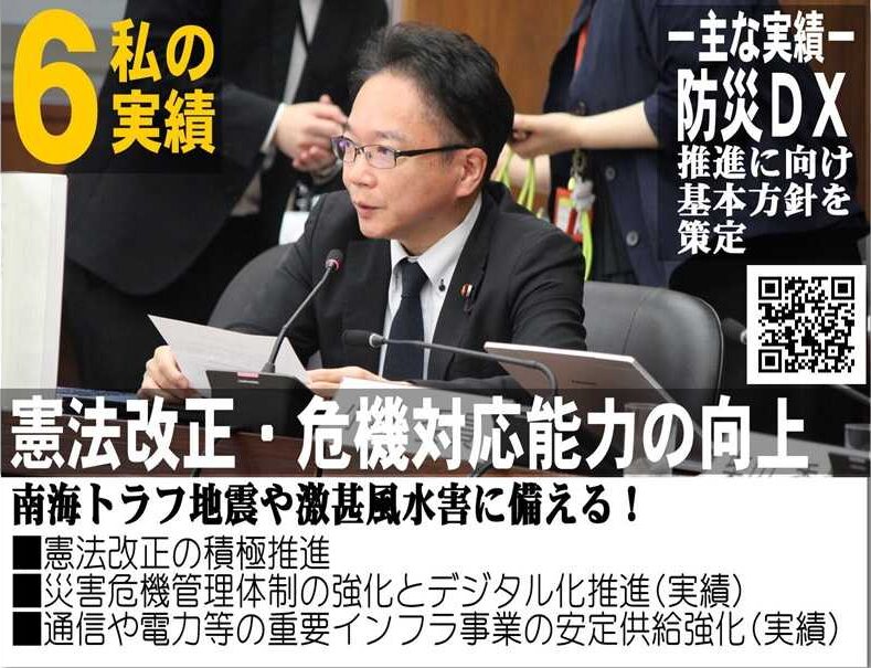 激甚化・頻発化する自然災害から国民の生命や財産を守るため、防災・減災・国土強靭化に注力していますが、100%避けることはできません。発災後の被害を最小減に食い止めるため官民連携の効果的な運用の実現に注力しています。特に近年注目されているのがデジタル化ですが、党の防災デジタルPT座長として(途中で防災担当の内閣府副大臣として)、本格的に危機管理として使えるシステムを目指して提言をまとめ、内閣府防災によって運用が始まりました。