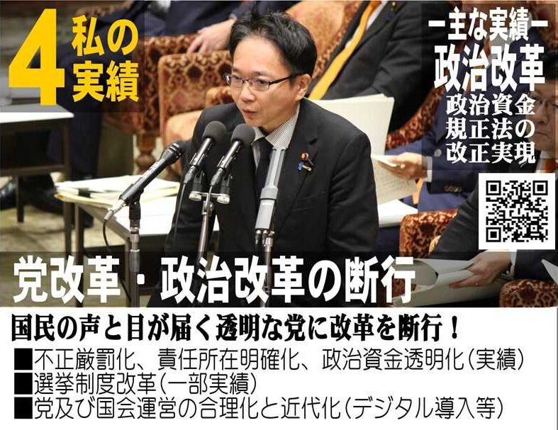 政治資金の不正防止のため、責任逃れを許さない本人責任明確化や厳罰化、第三者チェックの導入や透明化のためのオンライン化などを実現しました。政治資金規正法の改正です。法改正に馴染まないものも党則・党規約でも厳罰化しました。今後も運用改善に注力し、不正を許さない党運営となるよう注力していきます。